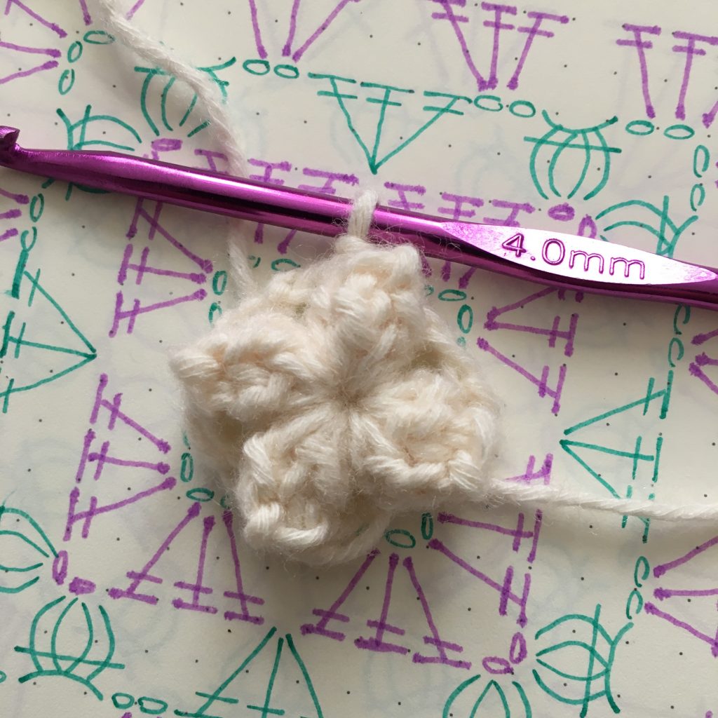 Rnd 1: Make a double magic circle. *Into the circle make a popcorn stitch, ch4* Repeat 3 more times. Pull the circle tight and ss into the ch4 space. (4 popcorn stitches, 4 chain spaces)