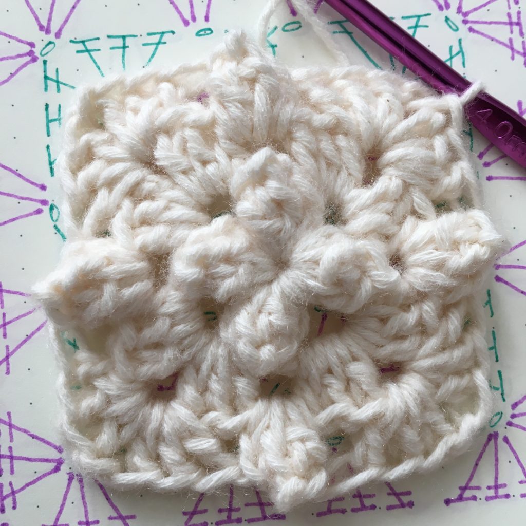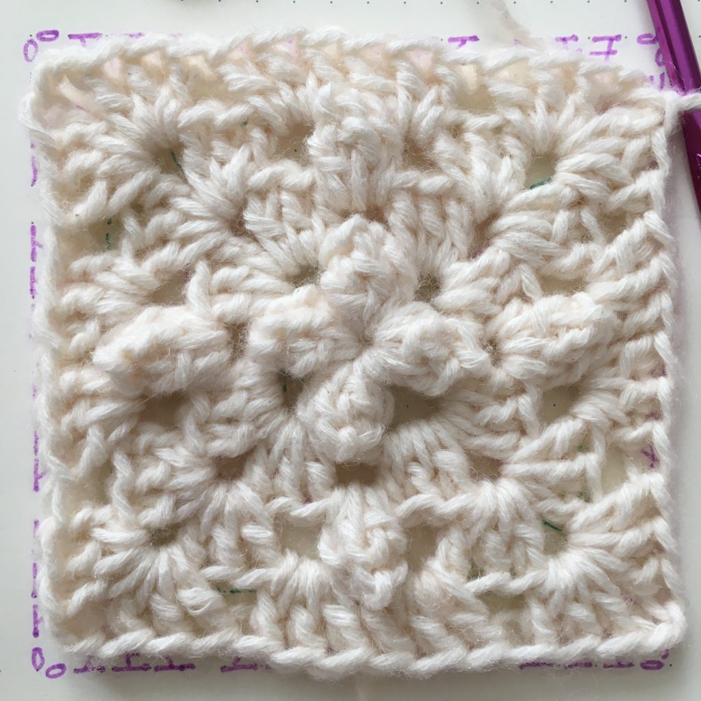 Rnd 3: Starting in the corner again, make a starting dc, ch1, 3dc. *Ch1, sk3, and work a popcorn stitch between the stitches, ch1, into the corner 3dc, ch1, 3dc.* Repeat 2 more times. at the end of the round by making 2dc into the corner you started at and ss into the chain space to join. (28 stitches)